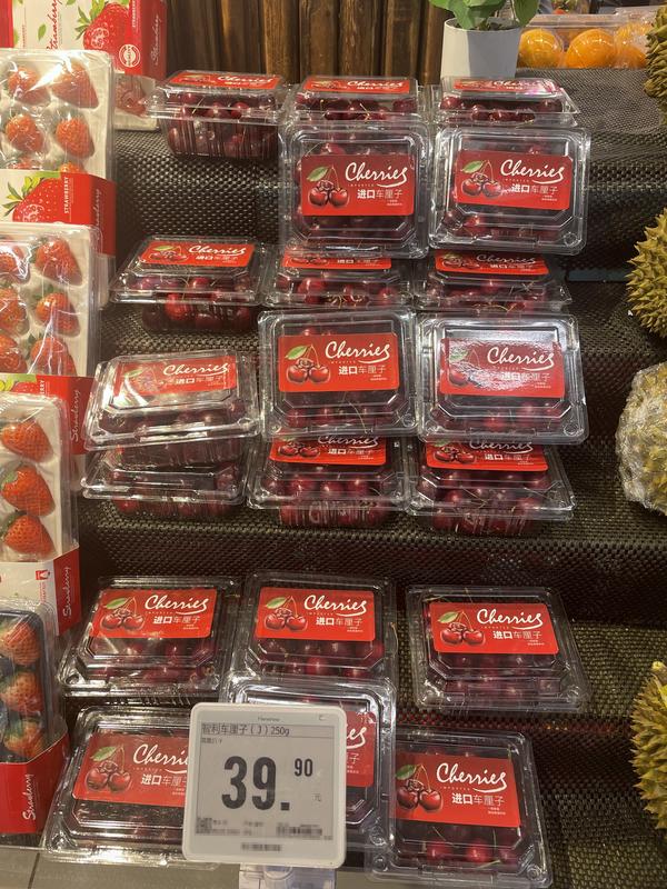 在钱塘的一家生鲜电商平台上,也有几款不同品种、不同规格的车厘子在售。2J的一盒250g规格,售价在49.9元。3J的一盒250g规格,售价在59.9元。其中,最大的4J车厘子,250g一盒卖99元。同时,还有整箱出售的5斤装的2J车厘子,为369元,相比较同级别小盒装,每斤便宜26元。5斤装的3J车厘子,为439元,相比较同级别小盒装,每斤便宜32元。如果家中人口多,购买需求量较大的,选择成箱购买会更划算一些。而在一家商超中,在记者到访当日,超市只有一种单J一盒250g规格的在售卖,价格为39.9元。暂无整箱出售的车厘子。