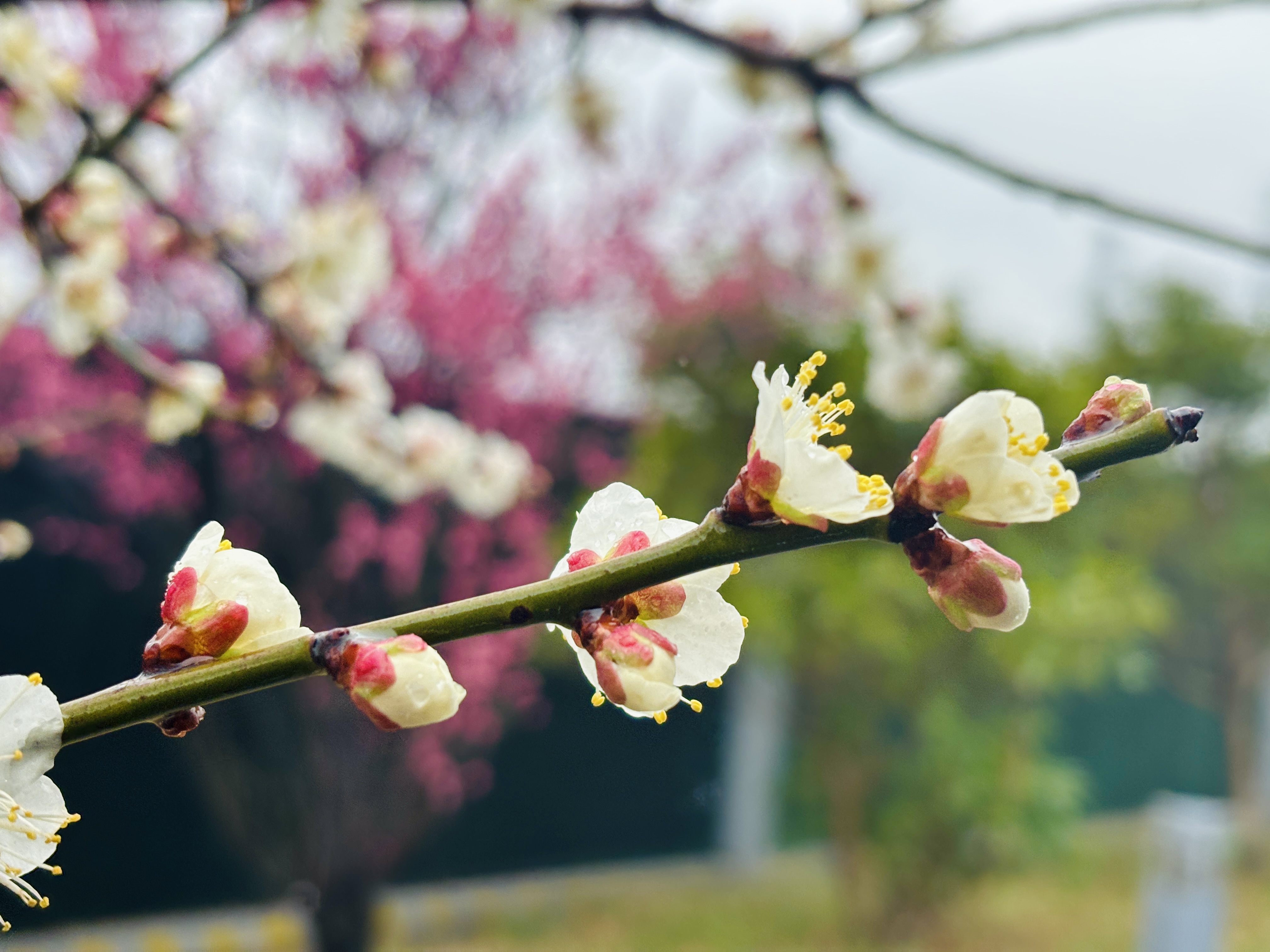 钱塘区政务服务中心门口,雨丝轻拂过白梅,晶莹剔透的花瓣更显纯洁高雅。细雨与白梅交织成一幅静谧画卷,散发出淡淡的幽香,沁人心脾,让人心生怜爱,沉醉在这份清冷而孤傲的美之中。(摄/方佳丽)