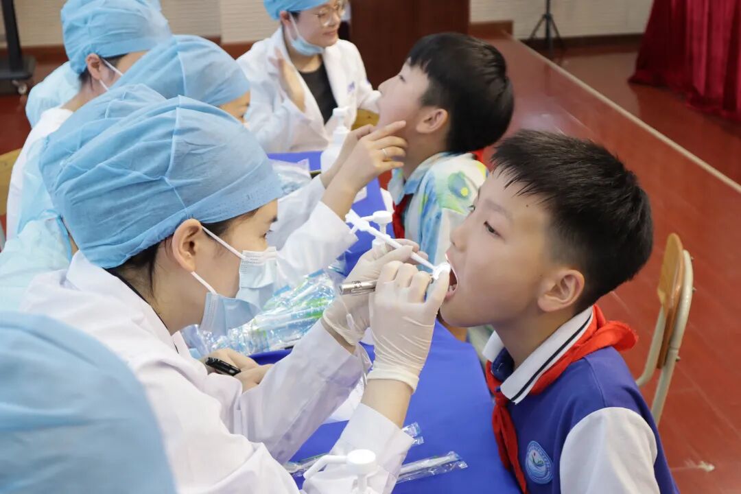 “小朋友,你很勇敢哦!”“啊——让阿姨看看这颗新牙长得棒不棒!”温馨的鼓励消除了孩子们的紧张,检查过程充满了关爱。
