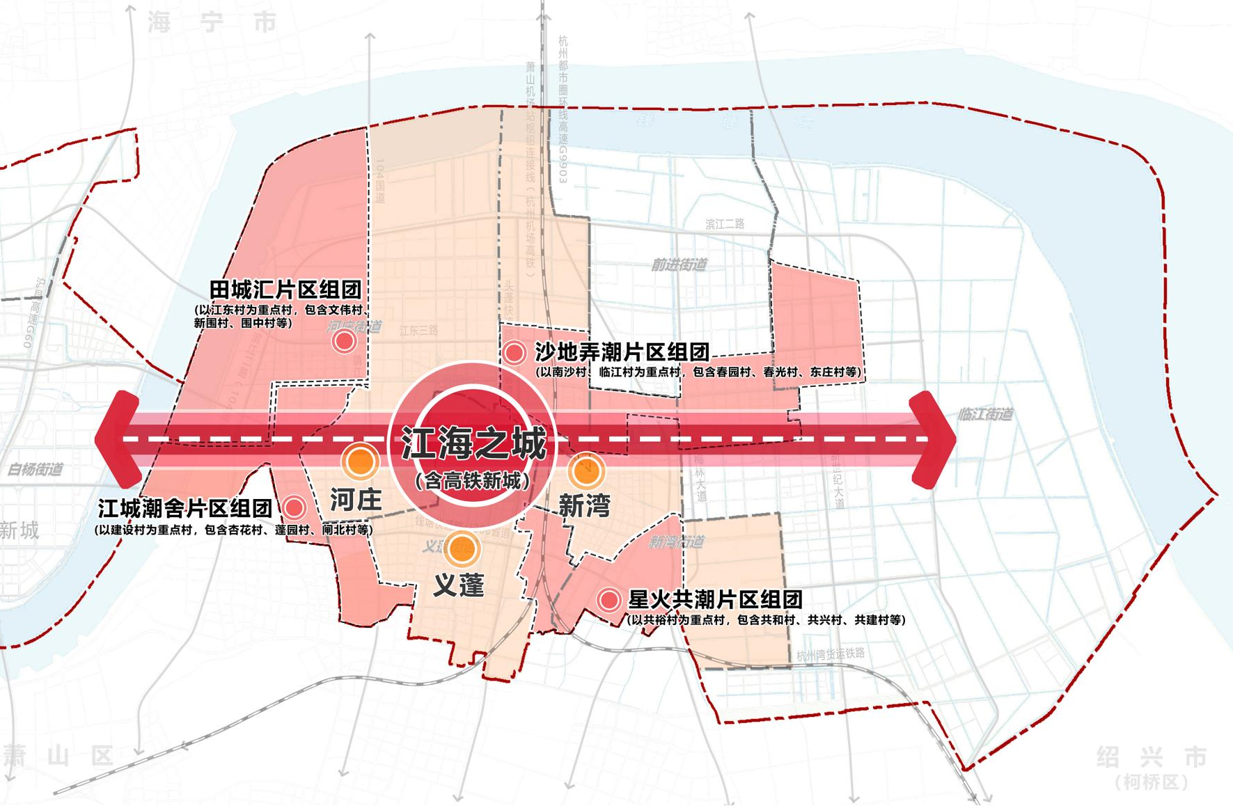 翻开发展轴规划,“一轴一心、三街四组团”的布局跃然纸上。这条“轴”聚焦缩小“三大差距”,以江东大道—地铁8号线为主轴,做强江海之城(含高铁新城)关键支撑,河庄、义蓬、新湾为中心镇(街),谋划了“产业轴”“服务轴”“带动轴”“基础轴”“共富轴”……如同一条绸带,囊括了城乡发展方方面面,串联起城乡协调发展的共同富裕版图。