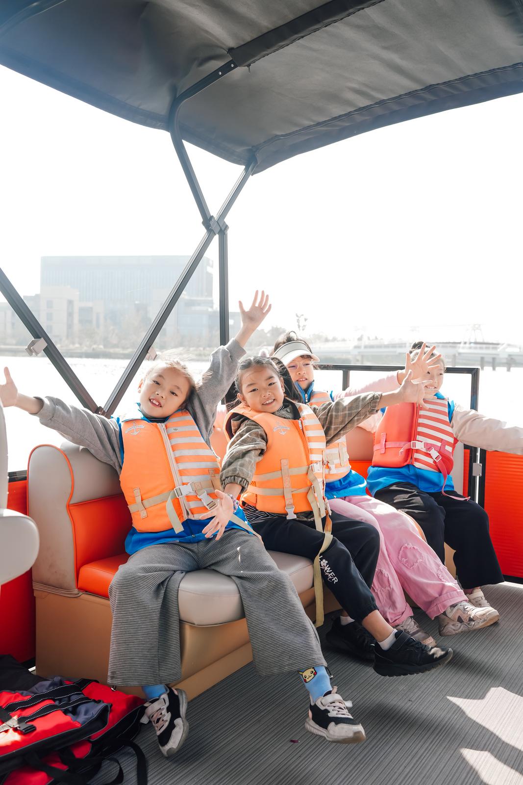 随后,观察团转至东沙湖水域,搭乘观光游船亲水而行。体验“舟行碧波上”的别样视角,感受城市生态与自然相融的和谐画面。观察团成员留意到“湖面很干净,没有漂浮的垃圾”。有小朋友提出“能不能在湖边多设置一些提示牌,提醒大家爱护水源,不要乱扔垃圾,我们小朋友会更喜欢看,也记得更牢。”成员们希望可以增加一些儿童游玩的项目和体验,在寓教于乐的同时,更好的感受大自然的乐趣。