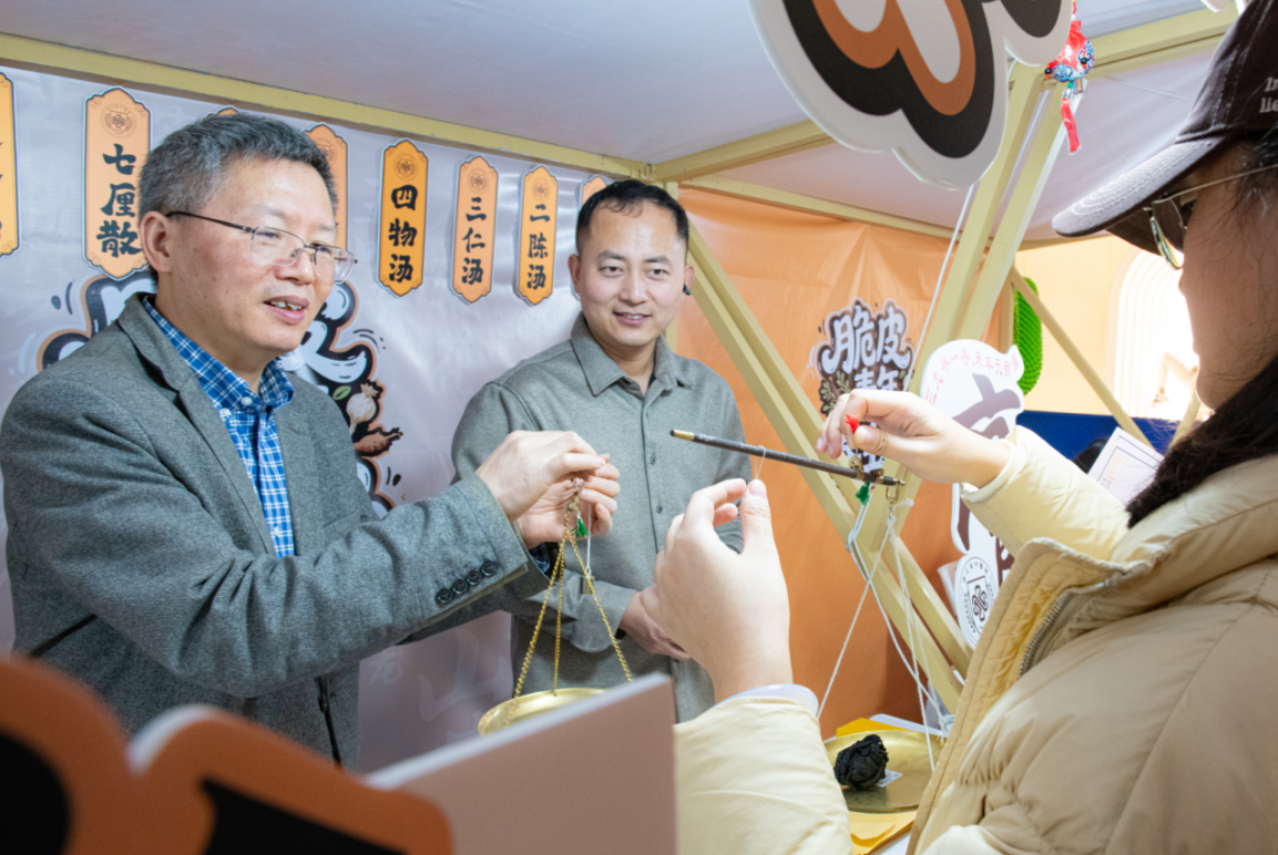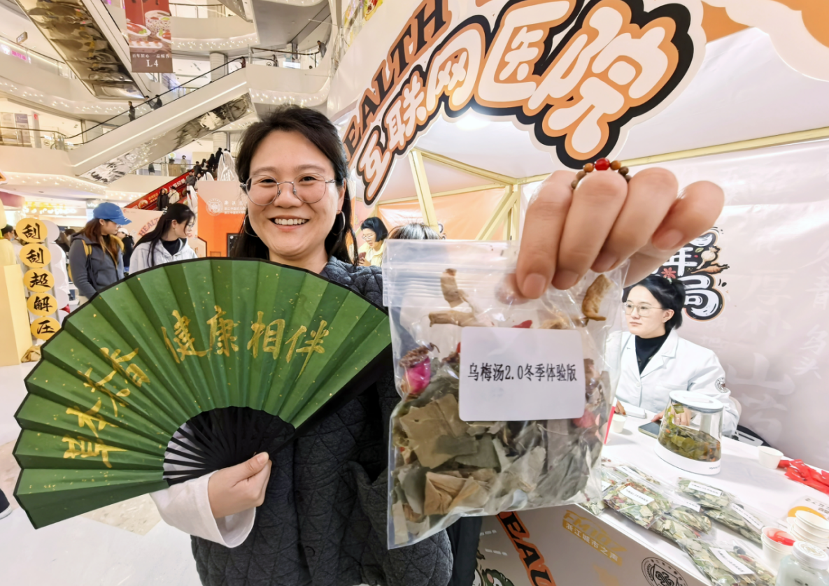 市集区设置了多个互动区域。中医护理适宜技术体验区提供耳穴贴压、刮痧、火龙罐综合灸等项目,吸引了一大批“脆皮青年”驻足参与。中药体验区、“按方抓药”和贵细药材辨识等互动区域人气颇高,专家对膏方制作流程和药材特性的细致讲解,让市民直观感受中医药文化的魅力。互联网医院特色产品体验区更是人头攒动,现场展示了膏方、足浴包、药膳包和乌梅汤2.0等系列产品。