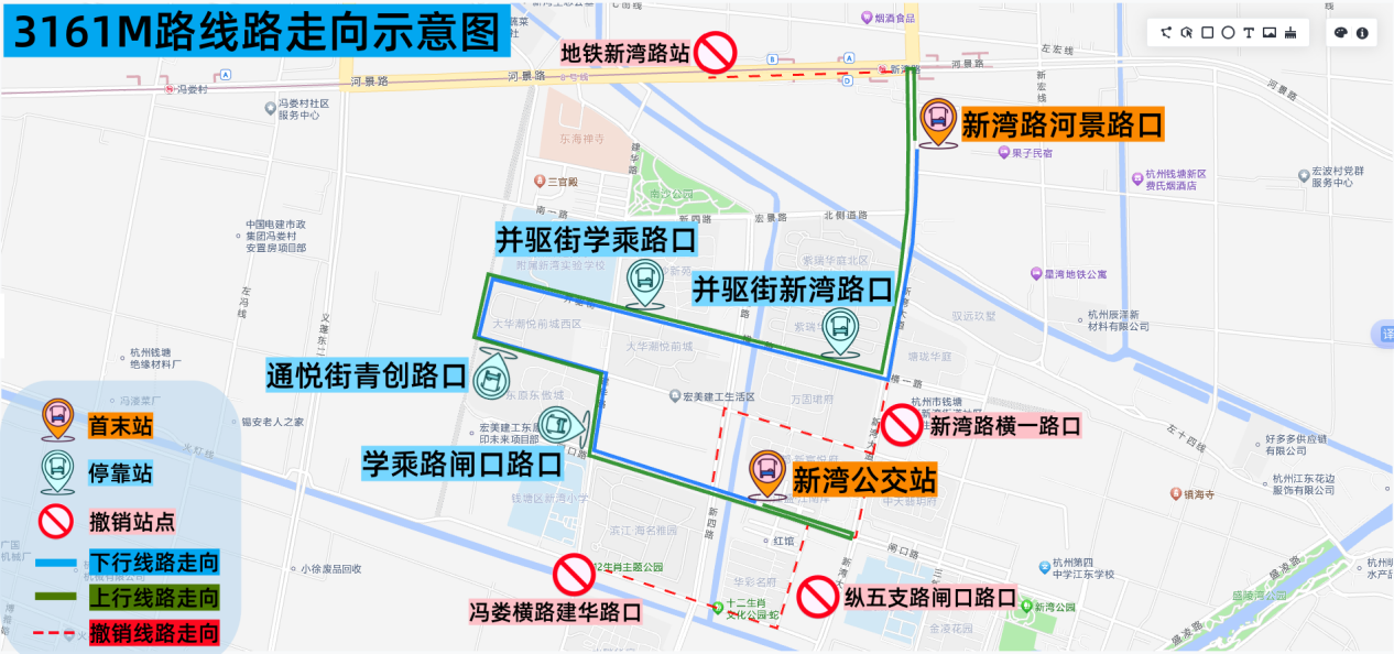 撤销站点:新湾路横一路口、纵五支路闸口路口、冯娄横路建华路口、地铁新湾路站4对(只)停靠站点。