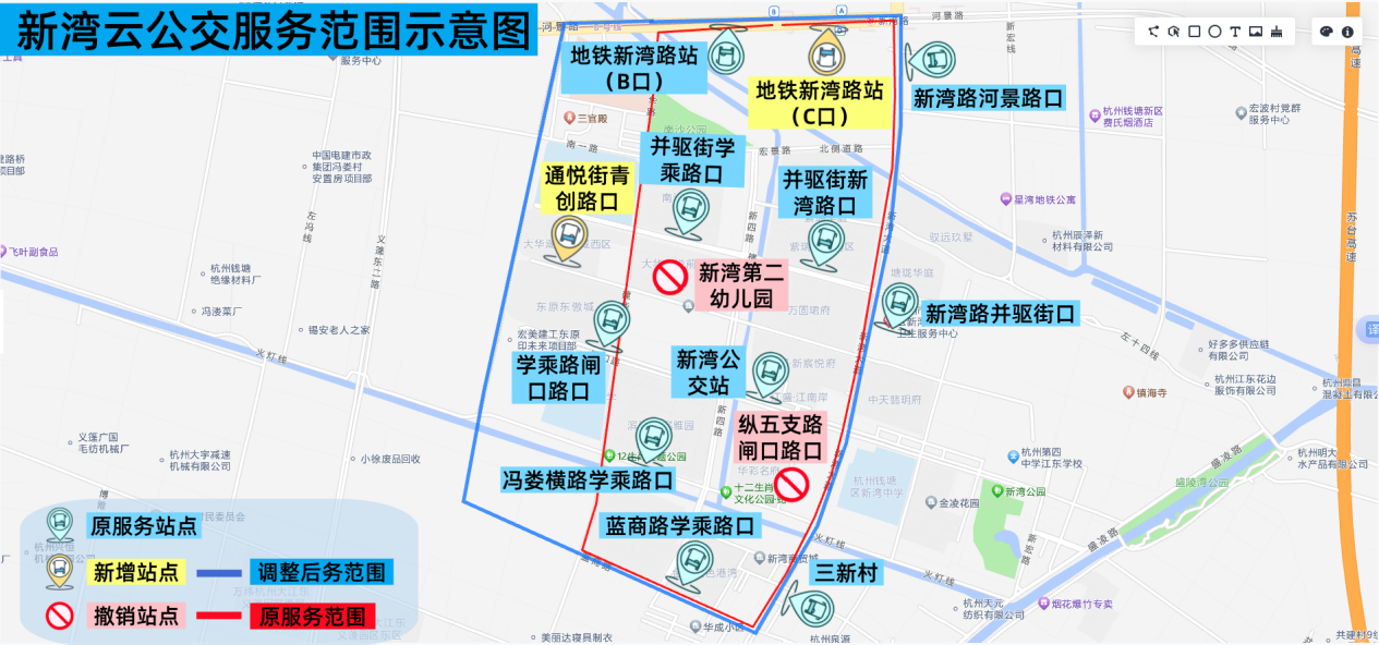 增设站点:学乘路闸口路口、通悦街青创路口、并驱街学乘路口、并驱街新湾路口4对停靠站点。