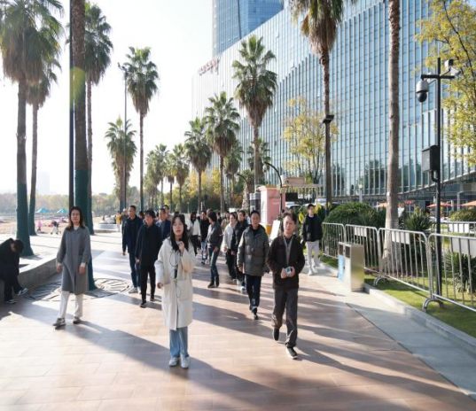 活动于下午拉开帷幕,代表们首先抵达金沙湖公园,实地体验了城市生态核心区的养护实效。金沙湖公园整体以“钱塘弄潮、踏浪金沙”为设计理念,涵盖绿地景观、活动广场、沙滩区块、湖面水域、环湖裙房、湖边跑道等配套设施。