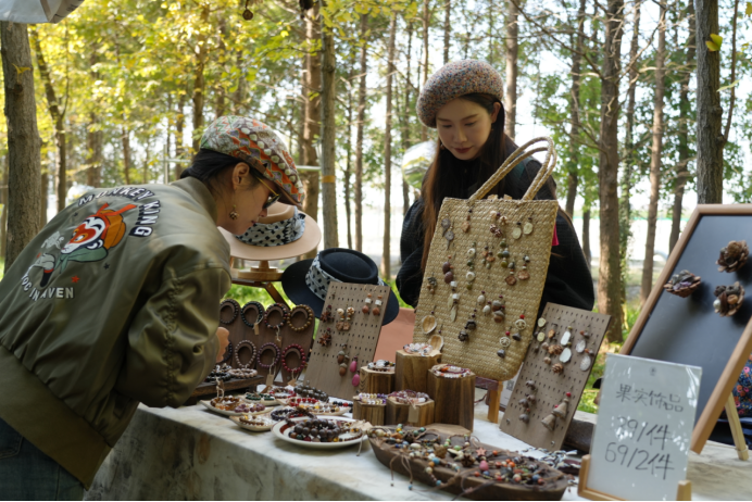 骑行结束后,人才们前往野鸟市集沉浸式体验这场以“米事・米市”为主题的创意盛会。市集内,大米制品、在地农产、非遗手作、暖冬美食等特色摊位琳琅满目,林间帐篷、串灯装饰营造出浓郁的露营松弛感,蓝晒体验、植物书签制作等互动项目让人才们亲身感受钱塘的烟火气息与文化魅力。