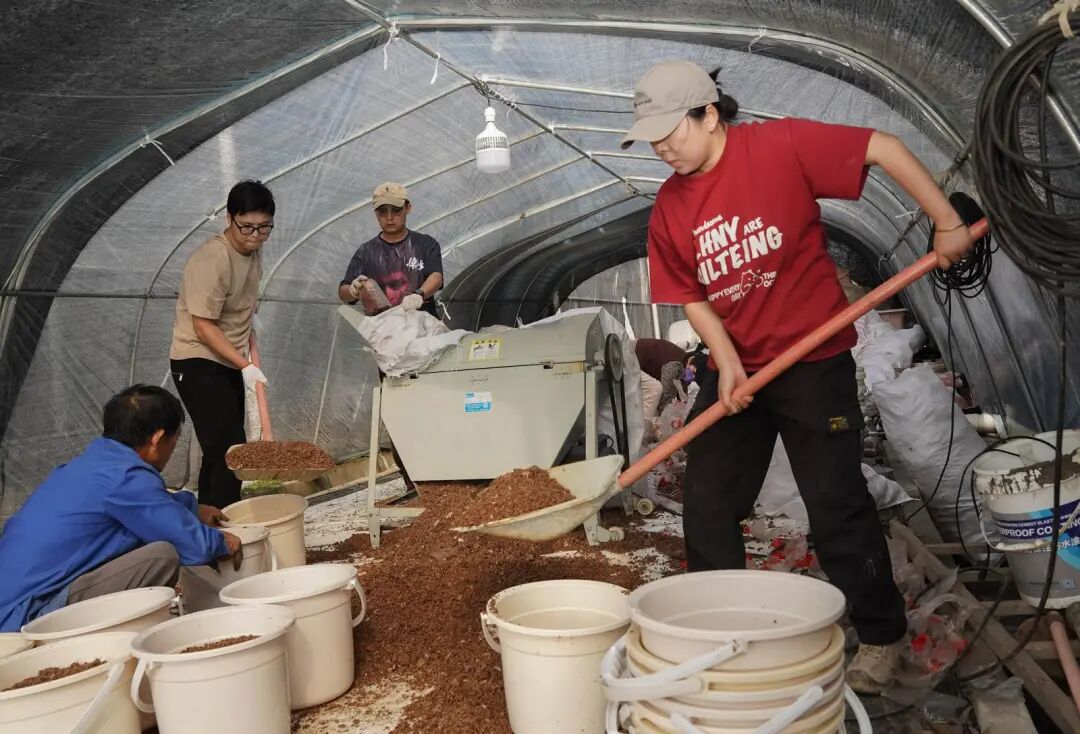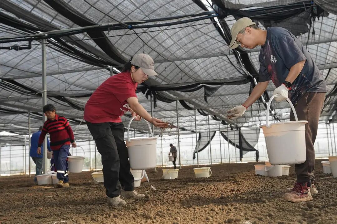“这样的生活,才有亲切感、有温度啊。”大棚里,沈正盼说着正弯腰将菌种精准地播入精心调理的土壤中。丈夫许柳在一旁默契配合,父亲操作着覆土机紧随其后。