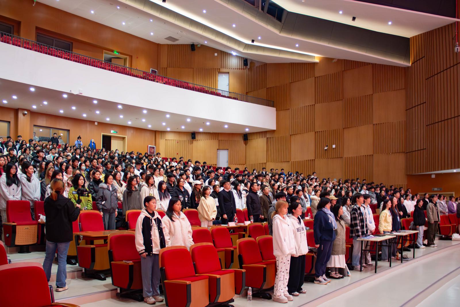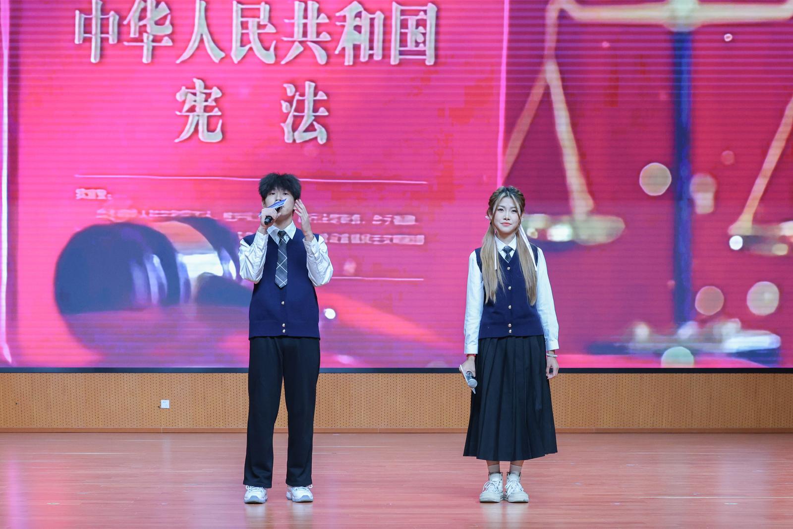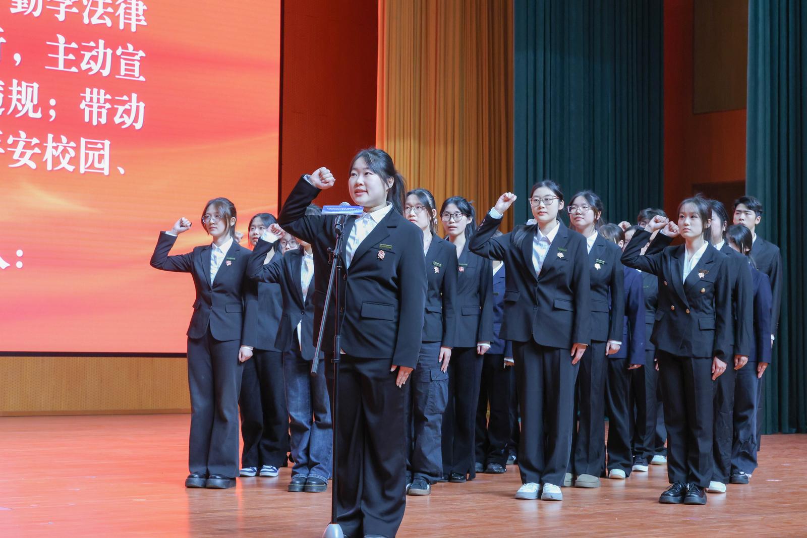 活动在雄壮的国歌声中拉开帷幕。活动举行校园法治安全宣传员聘任仪式,25名学生接过聘书后庄严宣誓,承诺“践行法治精神,传播安全理念”。学院声乐队演唱《宪法伴我们成长》,悠扬旋律传递法治与青春的共鸣;主持队朗诵《以吾辈之名,护宪法之光》,激昂语调诠释新时代青年对宪法精神的尊崇。