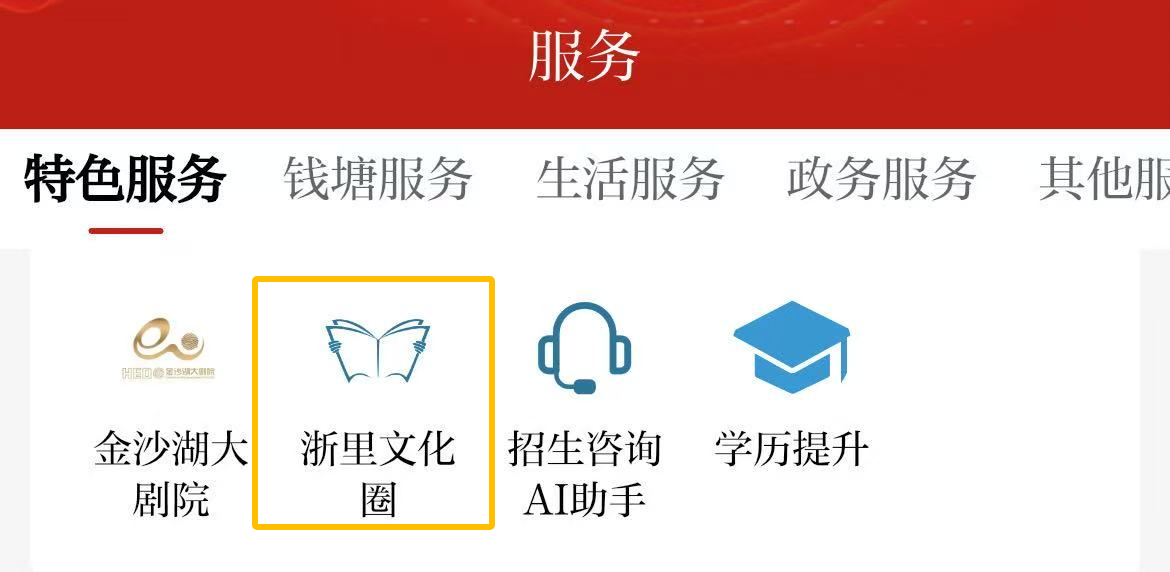 2.进入“服务”板块,点击“浙里文化圈”跳转至微信端口,并点击左上角主页后,选择本场活动参与,报名成功即可到场参加活动!
