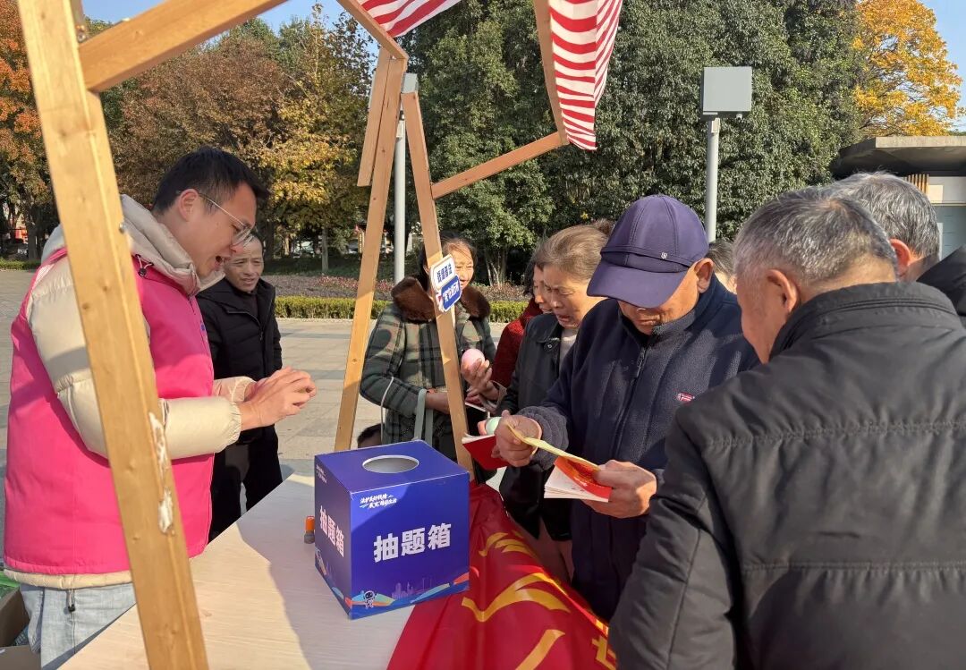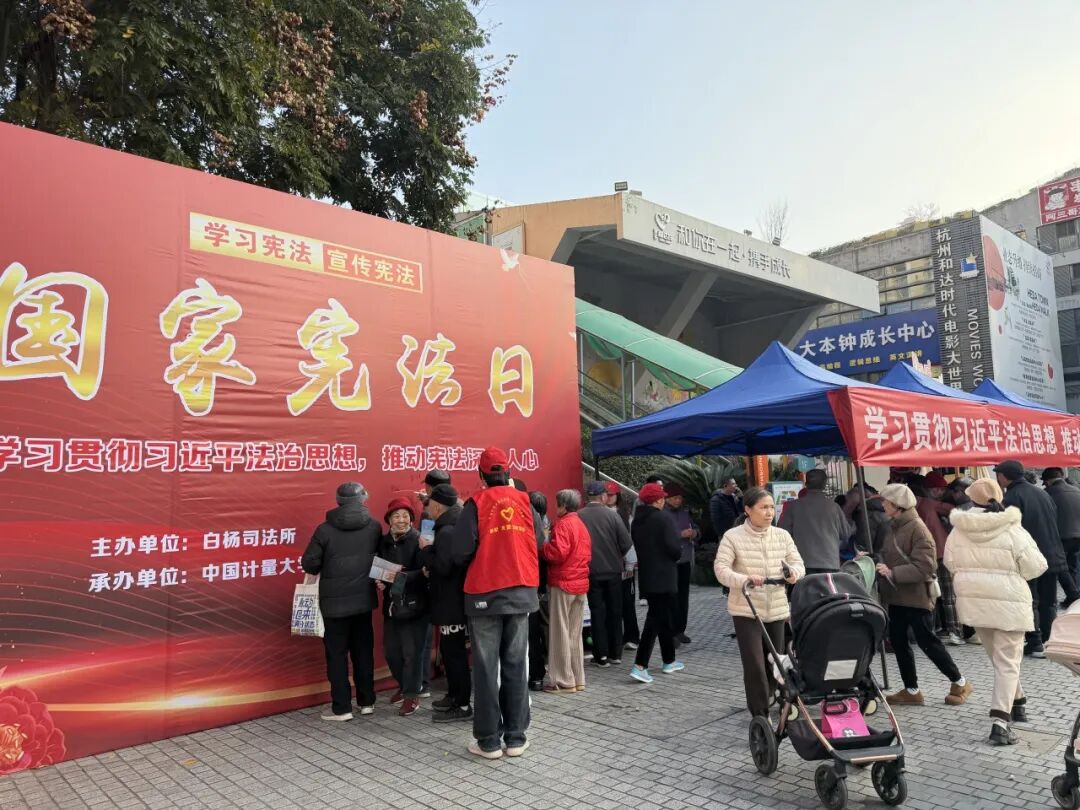 12月3日,白杨司法所与中国计量大学法学院在东东和达城广场联合举办“宪行万家,法护民生”主题宣传活动。活动充分发挥高校专业优势,由法学院学生志愿者担任普法主力。现场设置了宪法历程展板区、知识竞答区、签名承诺区及咨询答疑区。在志愿者引导下,居民通过抽取问题卡片参与有奖竞答,内容涵盖公民基本权利、国家机构职能等宪法知识。附近居民王女士连续答对三题后说:“原来宪法离生活这么近,关乎教育、工作、养老方方面面。”学生们在服务中深化了对“法治为民”的理解,实现了专业知识与社会实践的结合。活动累计发放宣传单页800余份,收集签名感悟近百条,实现了普法效果与育人成效的双赢。