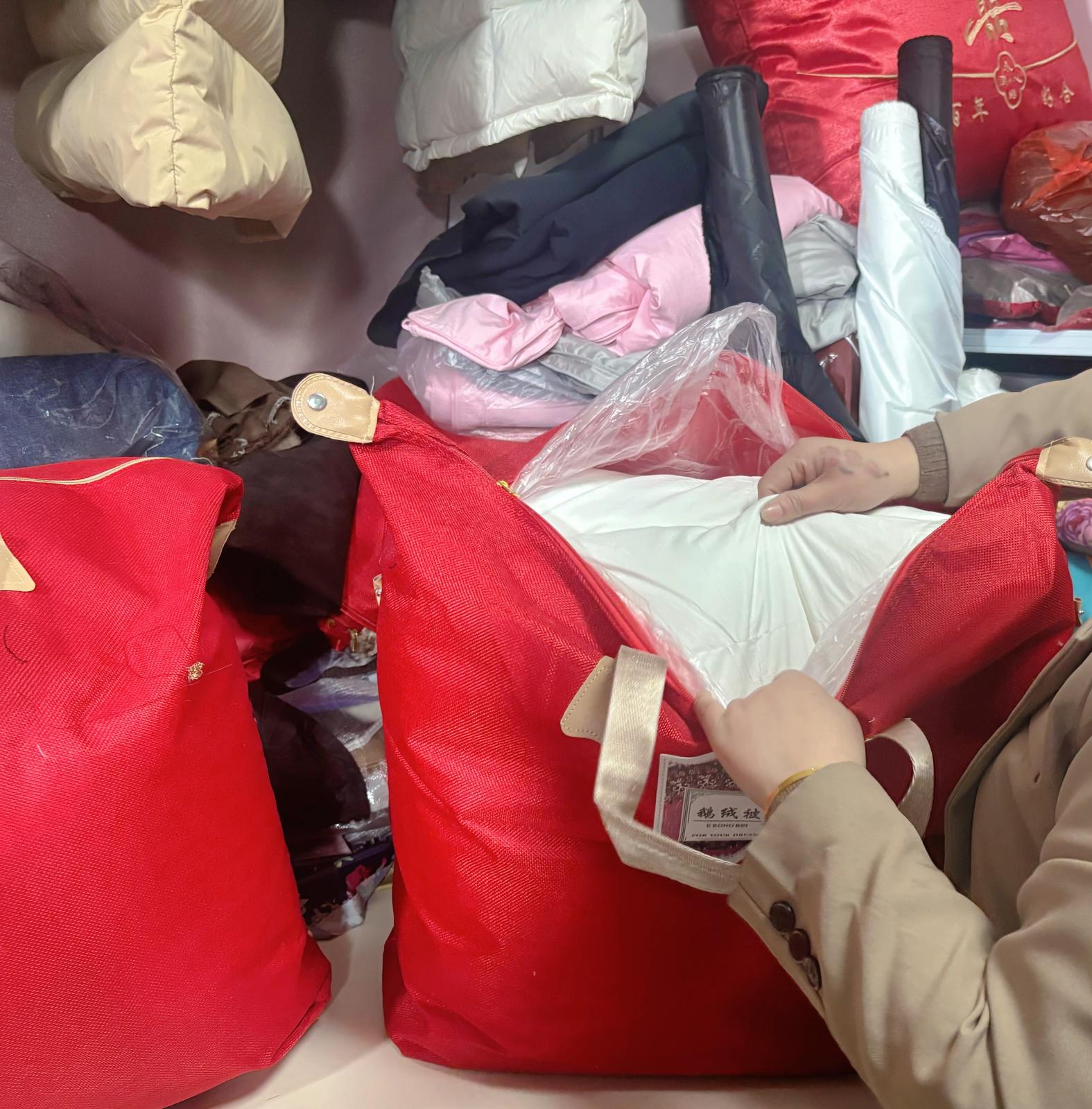 谈及定价,范春红说得实在:“咱们做的是街坊生意,丰俭由人,绝不乱收费!”羽绒被壳分单面和双面款,价格从200元到500元不等——单面款柔软亲肤,贴合肌肤更保暖;双面款厚实耐用,性价比超高,顾客可按需挑选。若是自带旧羽绒服来改,除了150元的固定加工费,每件拆衣需额外收取20元手工费;若旧羽绒量不足,店里还提供鹅绒(600元/斤)和鸭绒(400元/斤)补充,整体成本比买一床新羽绒被节省大半。