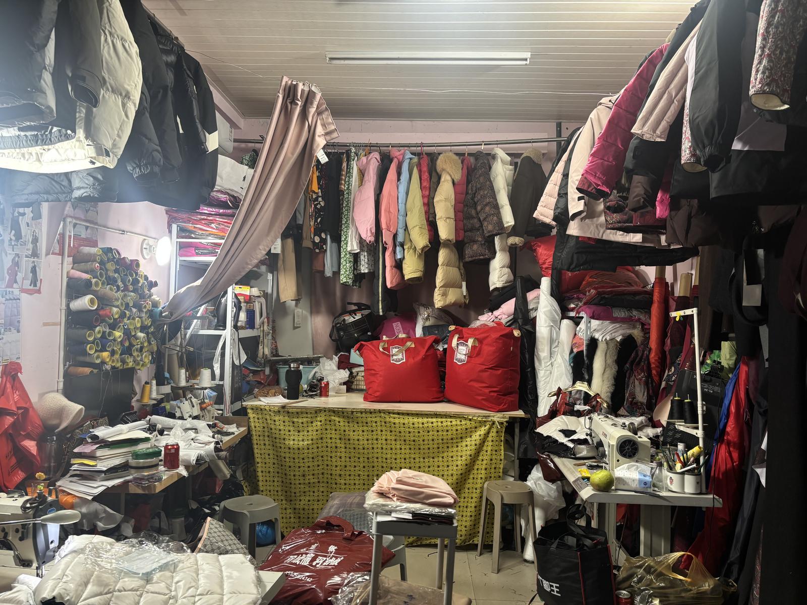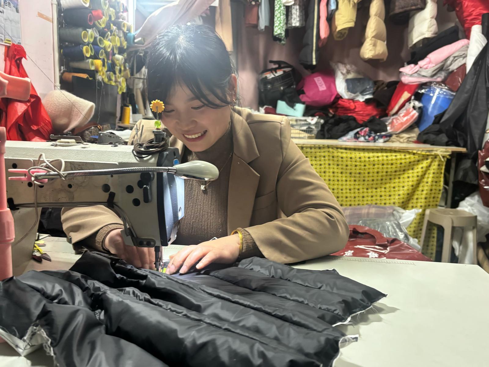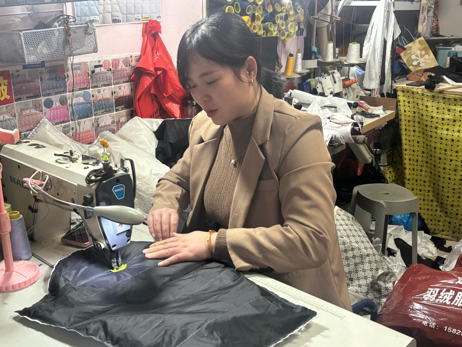 走进店内,缝纫机的“哒哒”声、剪刀裁剪布料的“咔嚓”声交织,货架上摆放着各式羽绒服和被码得整整齐齐的羽绒被。店主范春红正手脚麻利地踩着缝纫机,额头上沁出细密汗珠,头发上还沾着几缕羽绒绒毛,忙得连喝口水的工夫都没有。