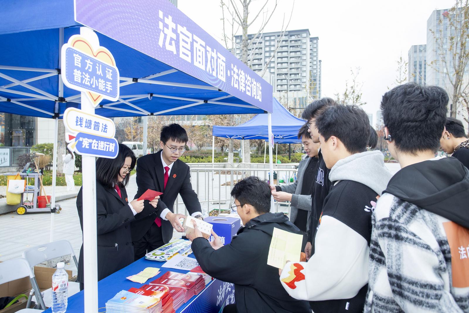 从开始到结束,活动现场特设的两大互动专区始终人头攒动。“法官面对面·法律咨询站”前,区法院工作人员针对婚姻家庭、劳动纠纷等热点提供“家门口”的专业指导;“钱塘法治荟·‘宪’问‘宪’答”专区通过有奖竞答吸引各年龄段参与,题目涵盖宪法、民法典等核心内容,现场气氛热烈。
