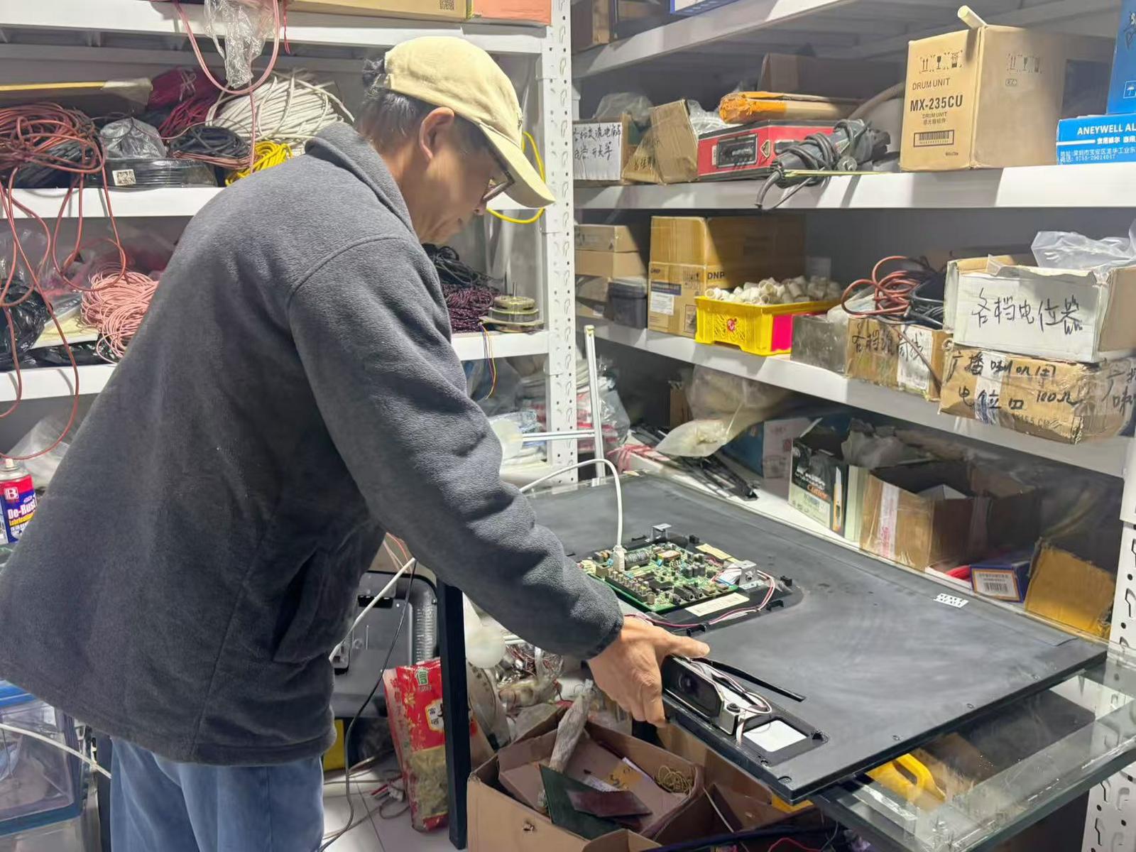 走进店内,蜿蜒的空间像一条“寻宝隧道”,转几道弯便到了裘建良的维修间。裘建良头戴棒球帽,鼻子上架着玳瑁眼镜框,笑起来很和气,正举着放大镜,对着液晶电视的复杂电路细细排查。
