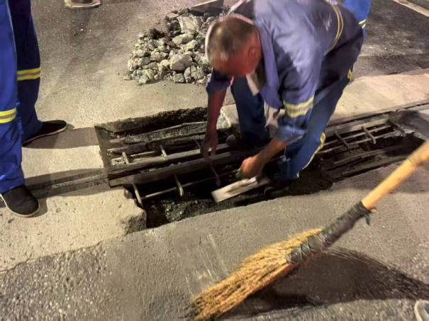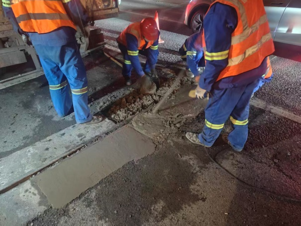 为了最大限度减少对白天交通的影响,市政集团制定了“夜间施工、白天通车”的方案。深夜时分,头戴安全帽、身着反光背心的工人们准时开工。冬夜寒风刺骨,他们轮流上阵,一丝不苟地清理旧缝残渣、处理基面、浇筑新材料。“这活儿必须精细,旧料清不干净,新缝就安不牢。”现场一位老师傅说道。施工过程中,团队还特别注重降噪与精细化作业,努力将对周边居民的影响降到最低。