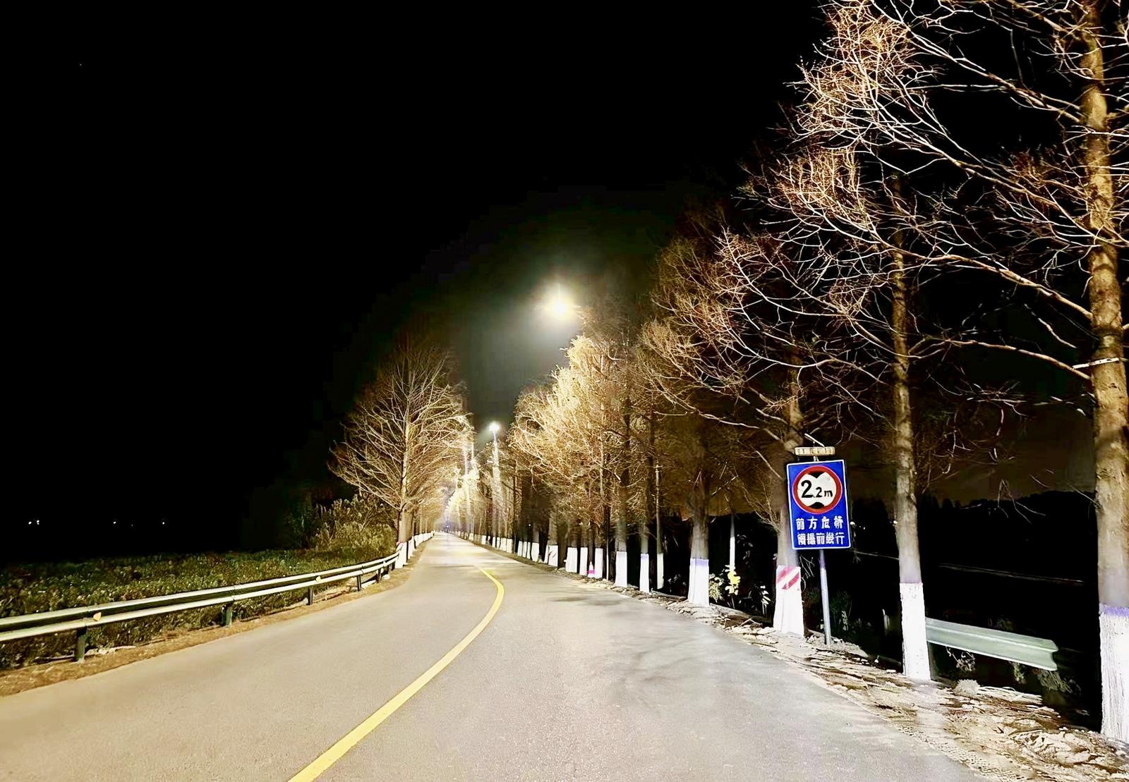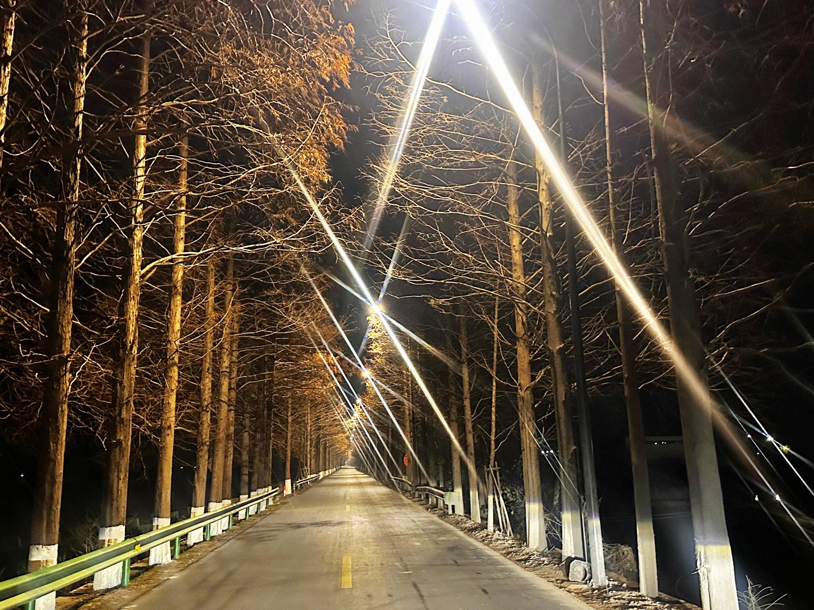 因此,亮化提升工程成为补齐安全短板、提升通行保障的核心举措。工程以“安全、便民、促产”为目标,实施全线科学布灯,消除照明盲区,并针对重型车辆通行特点,选用适宜照度与配光的灯具,显著优化夜间行车视线。一条明亮、安全的道路,不仅降低了事故风险,也为沿线企业延长作业时间、湿地公园发展夜游提供了更好条件。