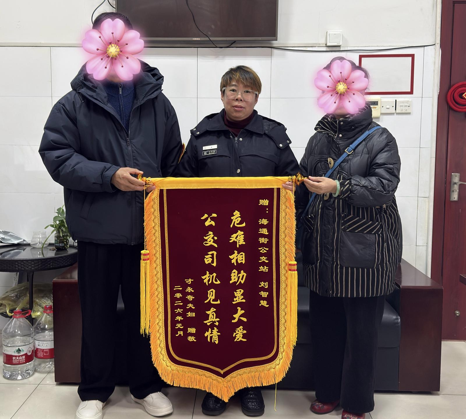 1月7日上午,康复的老人与家属专程来到海通街站房,将一面印有“危难相助显大爱,公交司机见真章”的锦旗送到刘智慧手中。“刘师傅,那天多亏了您……”老人握着她的手,声音哽咽。
