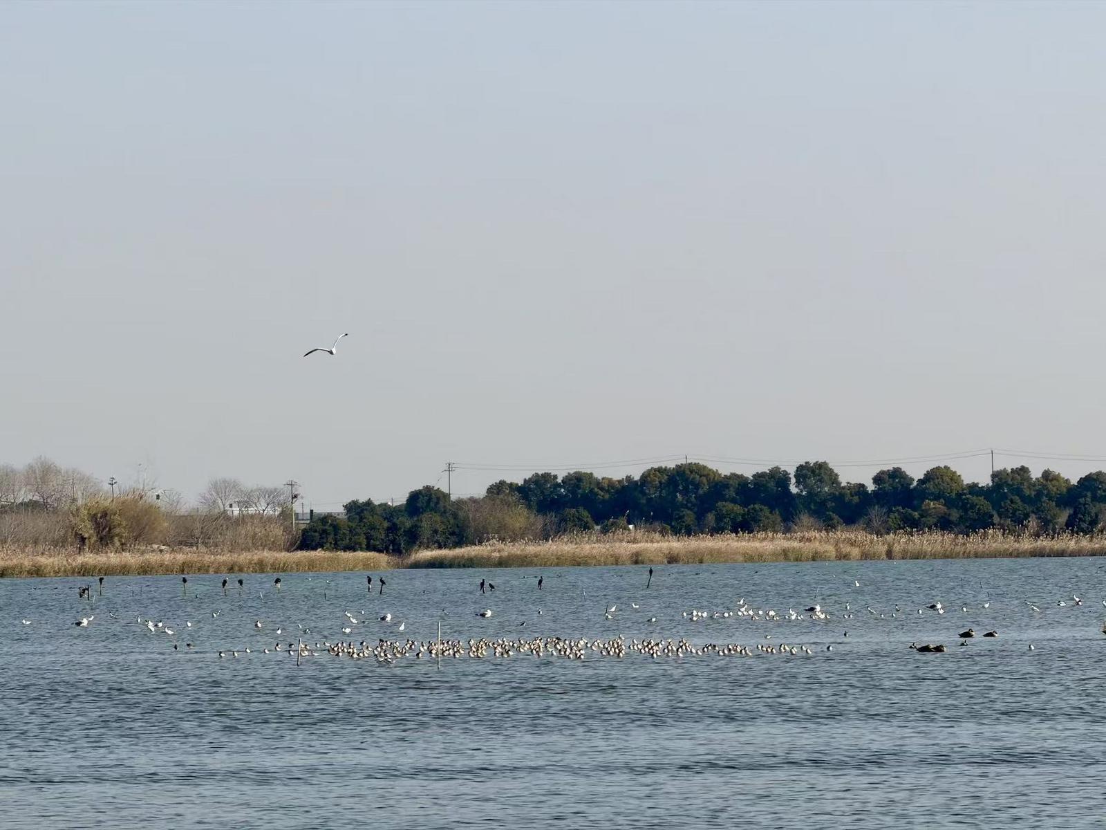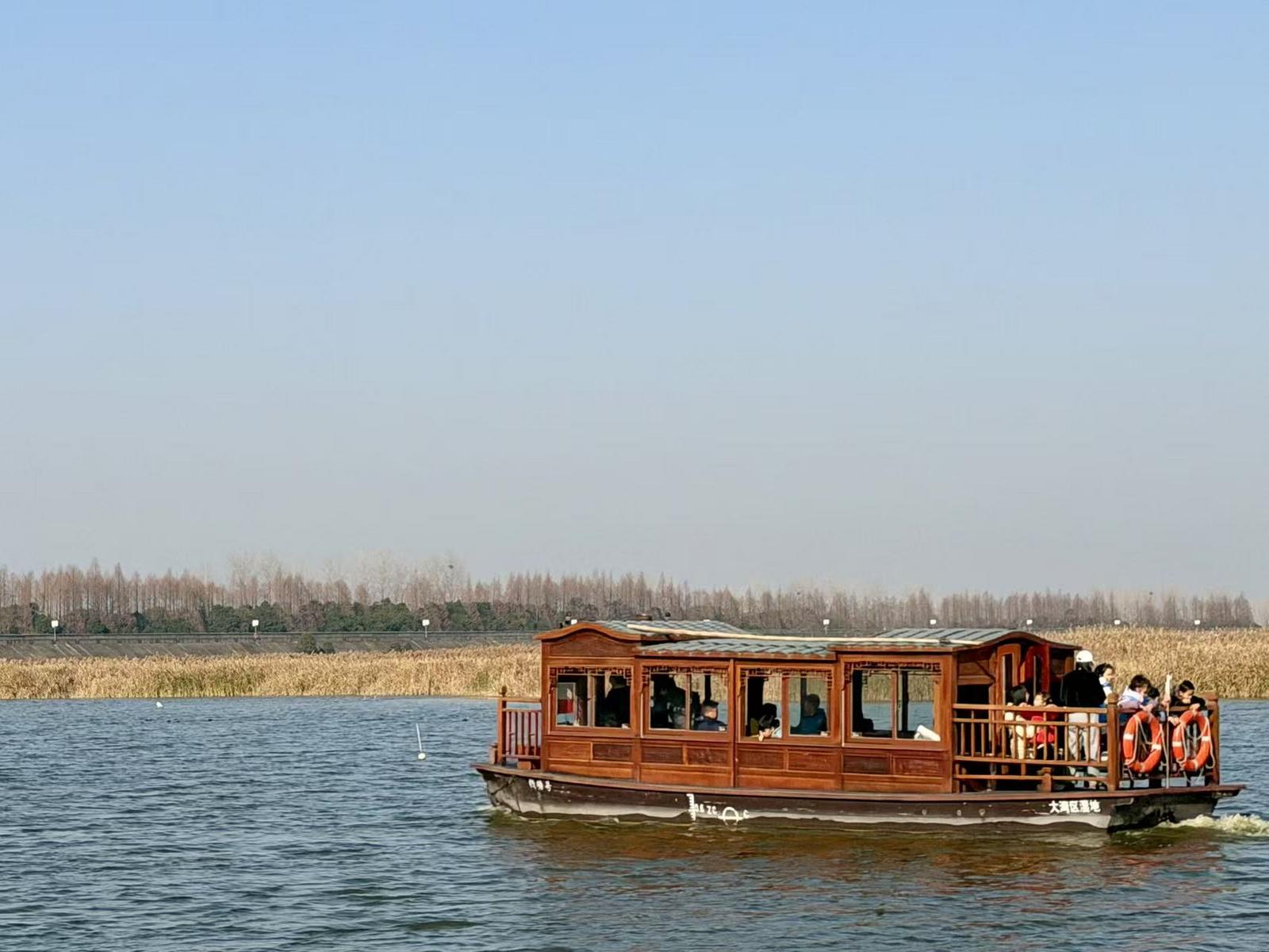 在陆路上,小观察员们乘坐观光车沿主干道及观鸟路线行进,宏观观察湿地广阔的冬季景观,捕捉鸟类在林间飞翔的动态。在杭州第一缕阳光升起的望海潮眺望钱塘江。随后,大家换乘游船,深入湿地水系内部。在波光粼粼的水面上,孩子们近距离观察到了水生植物的形态、岸线生态的纹理以及越冬水鸟的栖息状态。同时任真聆听了游船上专业的生态讲解广播,“如果船上能有专门给小朋友讲故事的广播就更好了,这样我们既能看风景又能听懂湿地的故事。”成员们在活动中涌现出各种精彩的观察成果与思考。这种从宏观到微观、从陆地到水域的切换,让孩子们对湿地生态有了更立体的认知。