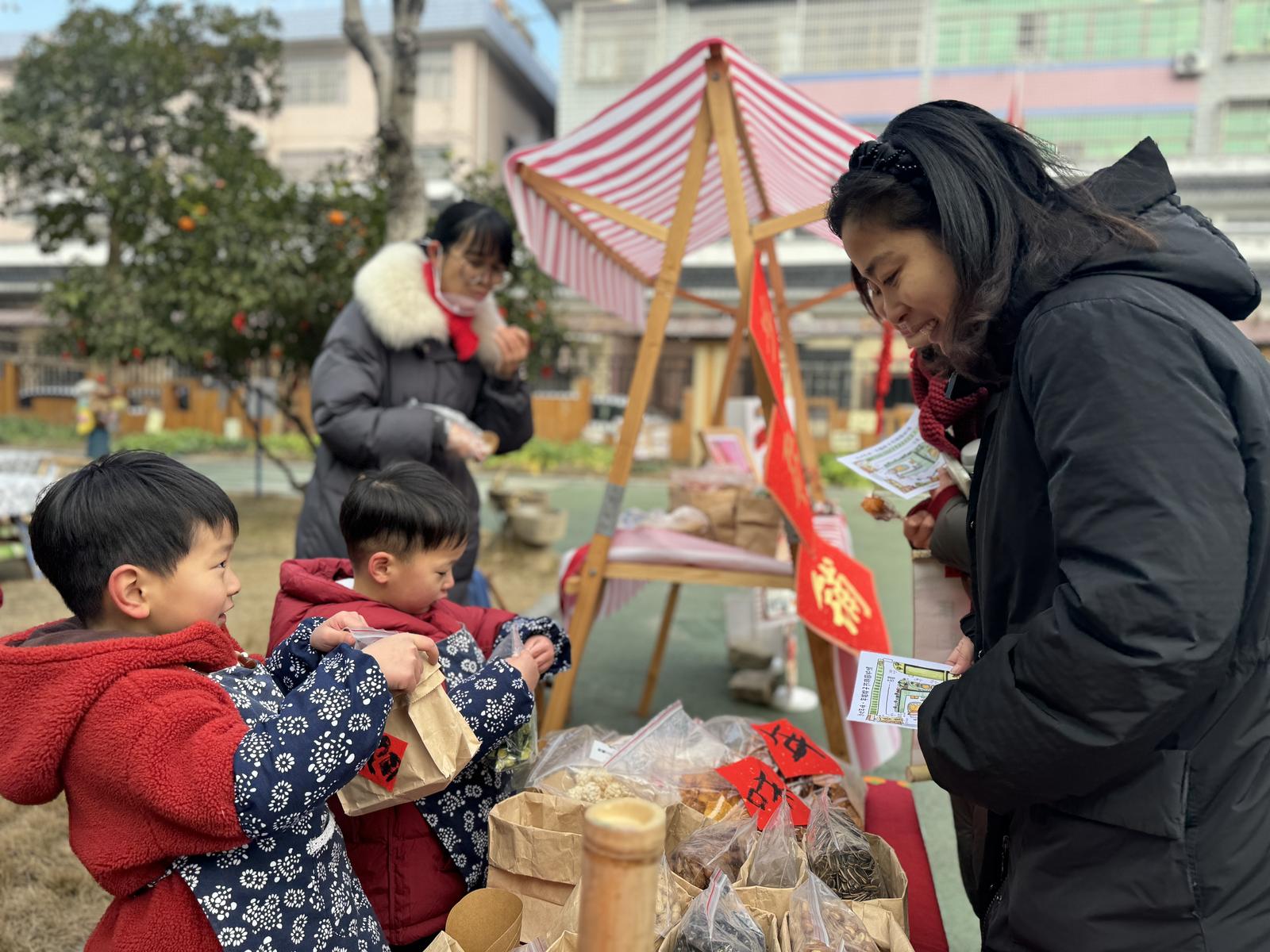 “彩沙”签到环节的巧思设计,让与会人员一入园便沉浸式感受沙地文化的独特魅力。随后,“沙地年味·年糕粽子节”主题游园正式开启。在沙地风味街,孩子们化身“非遗小掌柜”,在年糕、糖画、粽子等传统美食摊位前介绍、制作,让嘉宾在品尝中感受舌尖上的文化传承。在沙地文创街,花编、彩绘、送福、手工制作等区域展现了儿童指尖的创造力,传统民俗转化为可佩戴、可赠送的艺术作品,体现了文化在创造中的延续。在沙地童趣街,打年兽、跳房子、跳皮筋等传统沙地游戏欢声不断,吉祥物“禾禾”、“壮壮”穿梭互动,将节庆欢乐推向高潮。