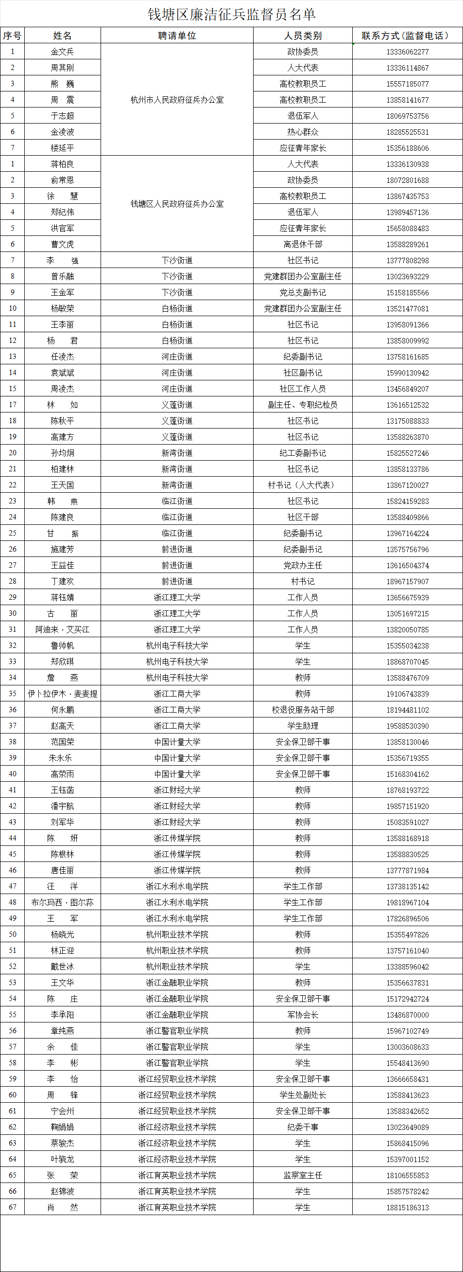 为营造风清气正的良好征兵环境,严肃征兵纪律,保证新兵质量,推动全区征兵工作持续向上向好发展,确保征兵工作公开、公平、公正,现将市、区廉洁征兵监督举报电话、监督员名单公示如下,欢迎社会各界对征兵工作进行监督。