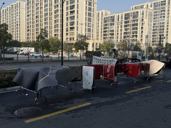 清洗后的地垫被统一移至路边绿化带上的晾晒区,工作人员用透气布覆盖保护,让它们在阳光下自然晾干,避免二次沾染灰尘。不少业主看着原本脏兮兮的地垫变得干净清爽,纷纷点赞:“平时自己洗地垫又费力又难晾干,这个活动太贴心了!”