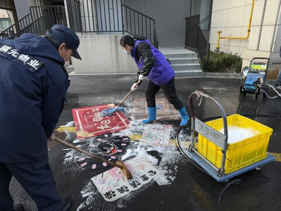 活动当天,便民服务点位前热闹有序。业主们早早带着自家的入户门地垫前来排队,物业工作人员也提前备好高压水枪、清洁剂、刷子等工具,等候大家到来。在清洗区,工作人员分工协作,喷洒清洁剂、刷子刷洗、高压水枪冲洗……无论是印着可爱图案的家用款,还是耐脏的素色地垫,都在大家的协作下焕然一新。