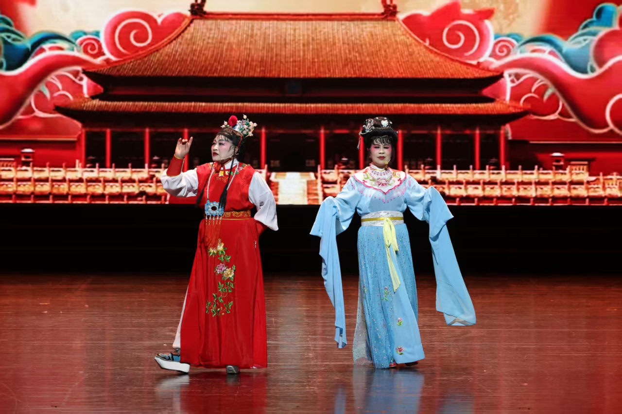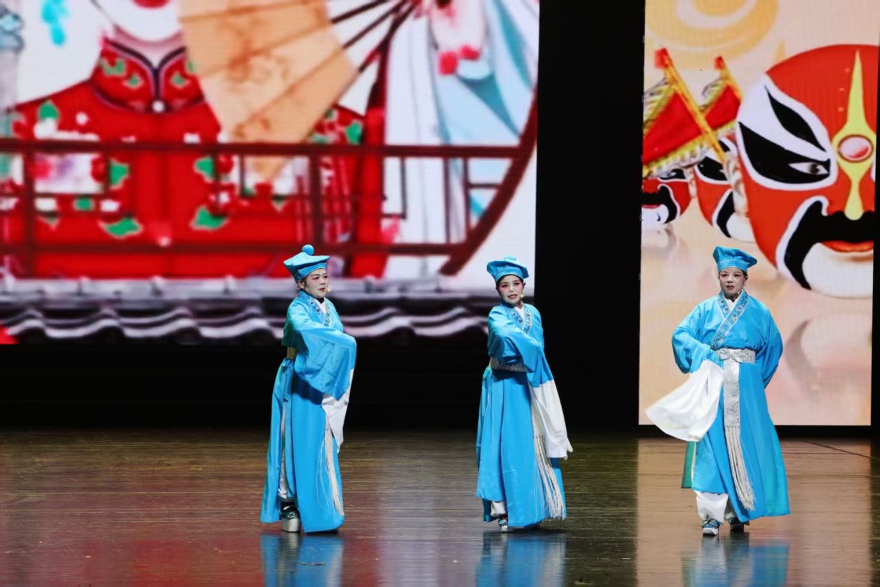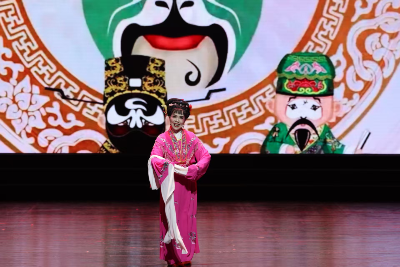 演出现场,群众耳熟能详的《梁山伯与祝英台》《九斤姑娘》《送花楼会》等经典剧目选段轮番呈现。队员们唱腔婉转、身段柔美,引得台下掌声不断。