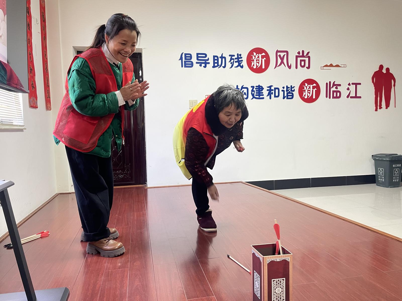 为迎接新年,活动设置了“趣味投壶”传统游戏。在工作人员的安全指导和鼓励下,庇护人员们跃跃欲试,专注地瞄准、投掷,每当有“箭”入壶,便引来阵阵欢呼与喝彩,大家在体验传统民俗乐趣的同时,也锻炼了手眼协调能力。