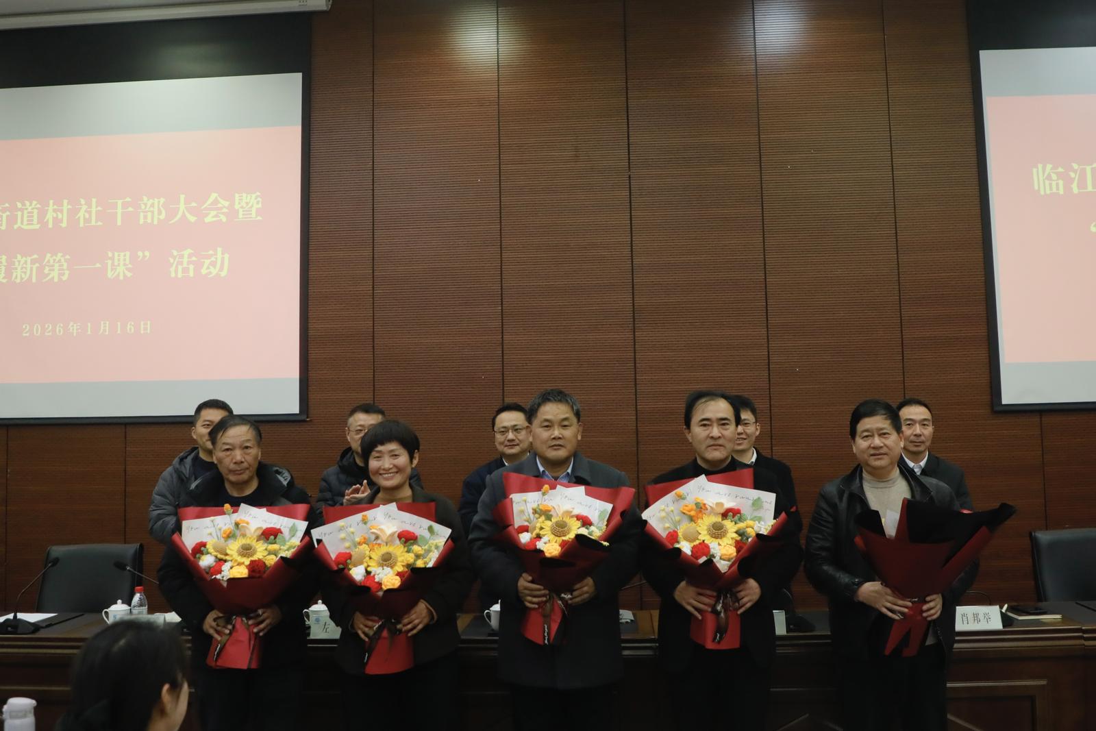 1月16日,临江街道举行村社干部大会暨“履新第一课”。街道班子领导,新一届村社“两委”班子成员、光荣退任干部及全体联村社干部参会。