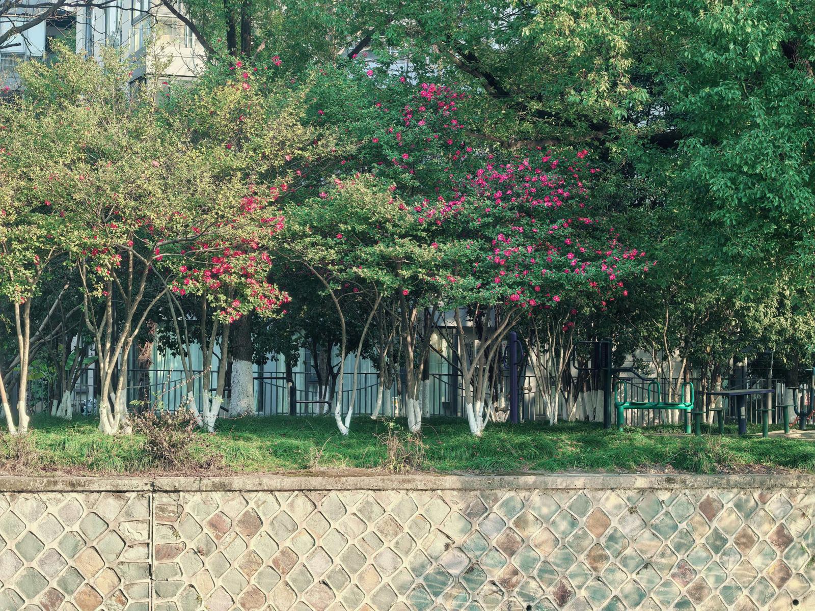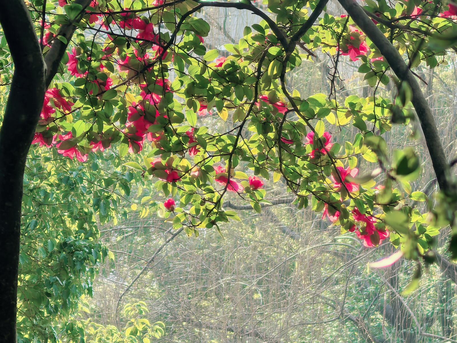 想要体验锦鳞公园的热闹之时,上午的朝阳是拍摄黄金时刻,光线柔和,能将花朵与水面一同纳入镜中。而内部的清幽小径中,茶梅与其他植物搭配营造出深邃的园林氛围,适合静静感受其幽寂之美。