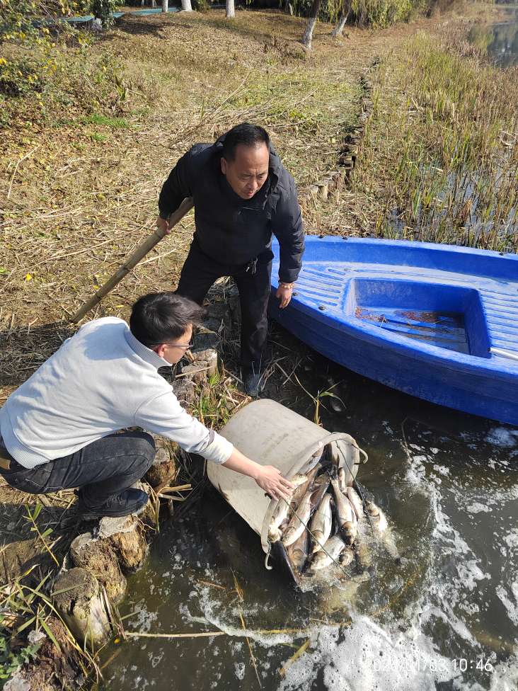 活动现场早已一片忙碌,工作人员带着专业工具细致忙碌:先对每一批鱼苗的数量、规格、健康状态进行抽样检测,从鳞片光泽到游动活力,每一个细节都严格把关,确保这些“小客人”个个符合投放标准,能在景观湖顺利安家。