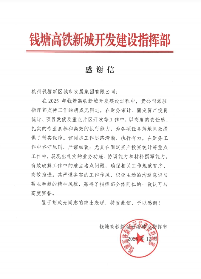 近日,高铁新城指挥部发来感谢信,信中对胡成光同志在派驻期间的担当与贡献给予高度赞扬,这即是对其个人专业能力的褒奖,更是临江公司积极服务钱塘区建设、为区域高质量发展提供坚实人才支撑的生动写照。
