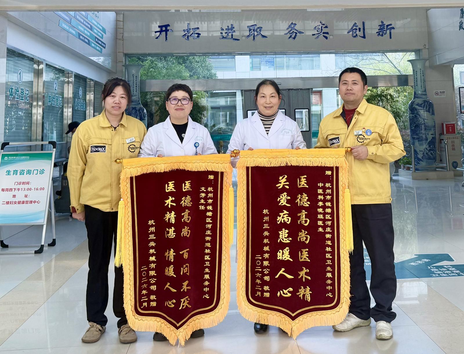 近日,河庄街道社区卫生服务中心(以下简称“河庄社卫中心”)洋溢着喜悦与感动的氛围。来自杭州三共机械有限公司的几名职工代表,手捧着两面锦旗,步履轻快地走进大厅,锦旗上的金色大字熠熠生辉——“医德高尚 医术精湛 百问不厌 情暖人心”“医德高尚医术精 关爱病患暖人心”。