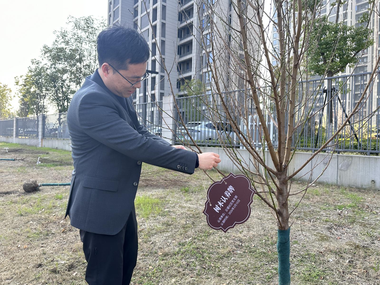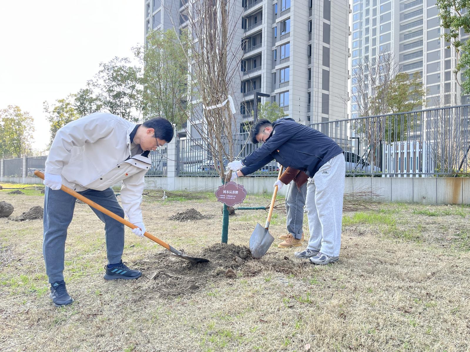 徒步到达终点,迎来了万众期待的植树环节。青年志愿者们三两分组,随着一声“开始种树”的召唤,有的挥锹挖坑,有的扶苗培土,有的提水浇灌,现场一片热火朝天。种植完毕后,大家共同为这片承载着深厚情谊的“党建林”插上“共建纪念标识”,并在标识牌上写下青春寄语。小小的标识牌,承载着青年对社区的热爱与责任,也铭刻着团组织与联建单位携手同心、共建共享的青春印记。