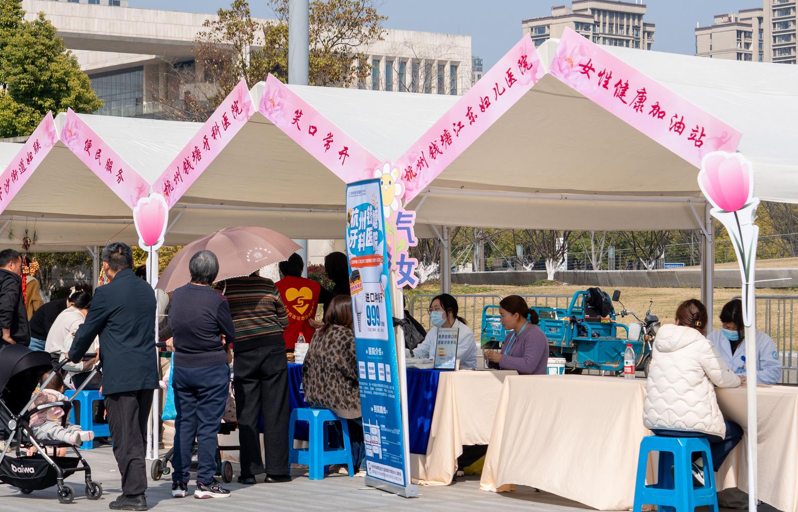 口腔健康区: 杭州钱塘牙科医院的口腔团队携带便携设备,为市民进行免费口腔检查,针对不同生理阶段的口腔护理要点给予个性化指导,帮助大家守护灿烂笑容。