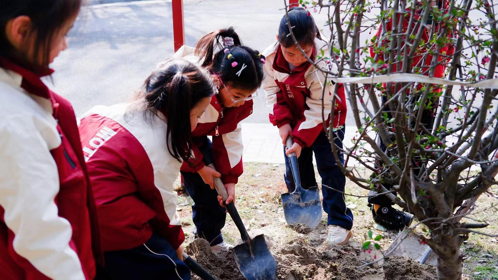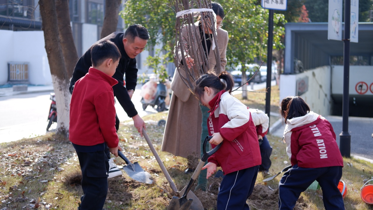 留住指尖的微观世界后,小朋友们来到了户外,迎接一项“大工程”——和社区的叔叔阿姨一起种植真正的树苗!活动现场,身姿挺拔的民兵叔叔首先上场,他们挥起铁锹,几下就挖出了一个标准的大树坑。小朋友们围在一旁,瞪大眼睛看得入神,不时发出“哇,叔叔好厉害”的惊叹。大坑挖好后,大家搬来了一棵茁壮的小树苗,稳稳地放入坑中。孩子们迫不及待地拿起小铲子,虽然动作还显稚嫩,但那股认真劲儿却一点不输大人。他们分工合作,有的填土,有的扶着树苗,齐心协力把泥土回填到树坑里。