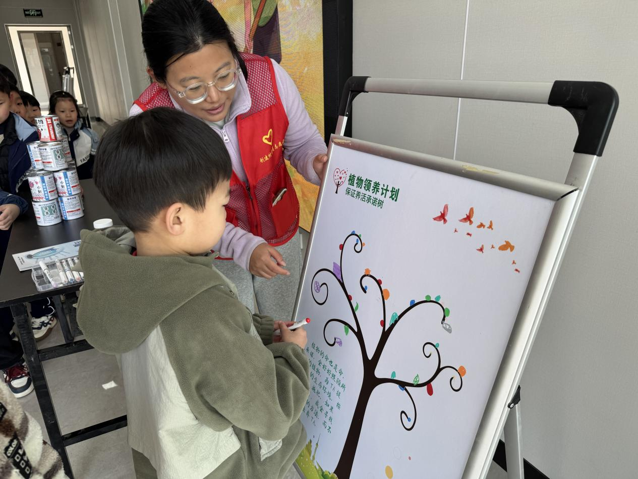 活动现场气氛热烈、童声阵阵。工作人员用通俗有趣的语言,将“扫黄打非”知识化作生动的小故事和情景问答,向孩子们讲解不良读物、有害信息的危害,引导大家自觉远离低俗内容。“原来盗版书也会伤害我们呀!”一名小朋友认真地说;“我要把今天学到的知识讲给爸爸妈妈听!”另一名孩子兴奋地举手分享。童言童语中,文明意识悄然生根。随后开展的绿植领养、承诺树绘叶等环节井然有序,孩子们或扶苗培土,或提笔绘叶,在承诺树枝干上郑重“签名”,一片片翠绿的叶子承载着他们“爱绿护绿、远离有害、争做文明小卫士”的纯真诺言。欢声笑语与盎然绿意交织,文明理念在互动体验中愈发深入人心。