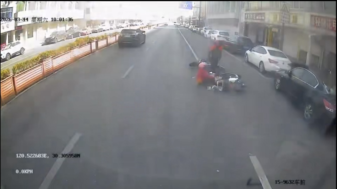当时,闪佳师傅正专注观察前方路况,突然发现前方机动车道上,两辆电瓶车发生碰撞,其中一位阿姨不慎摔倒在地,另一位电瓶车骑手则在一旁焦急地说着什么,现场情况十分混乱,不仅影响过往车辆通行,摔倒的阿姨也面临着二次受伤的风险。