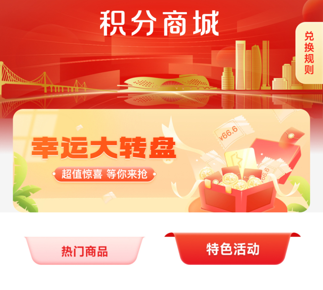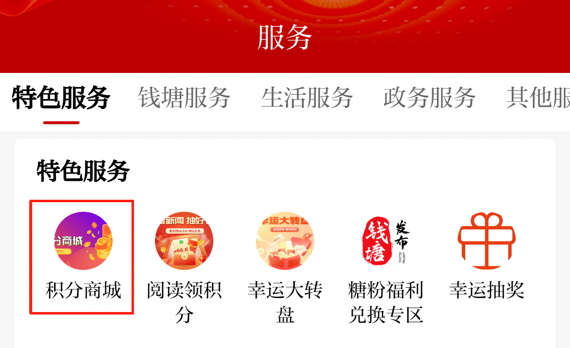 2.进入APP“服务”板块,点击“积分商城”—“特色活动”。