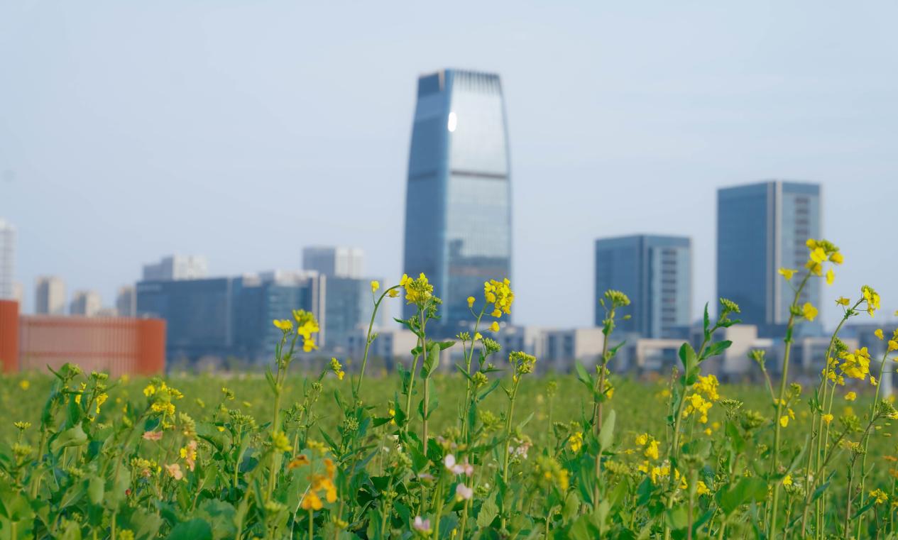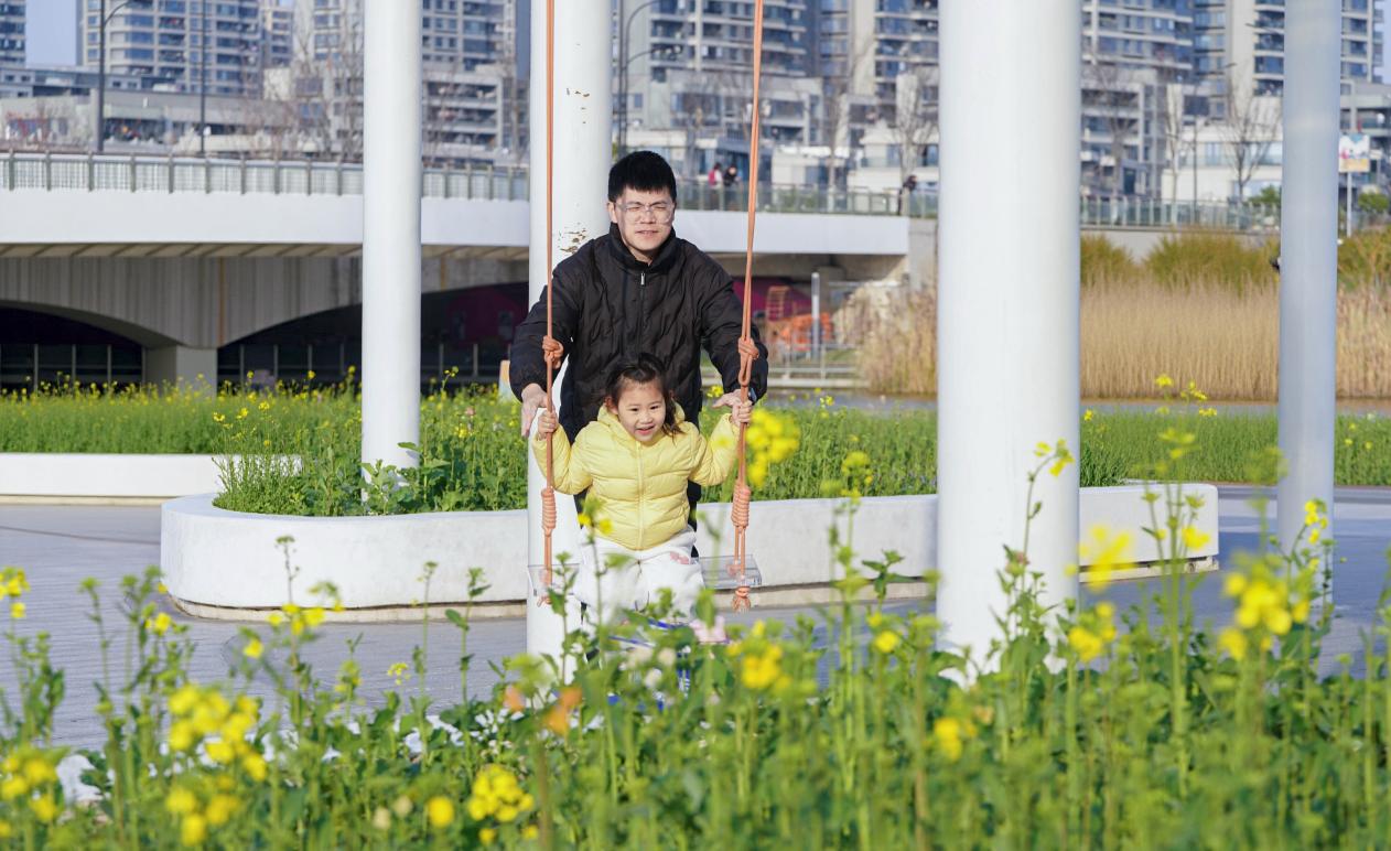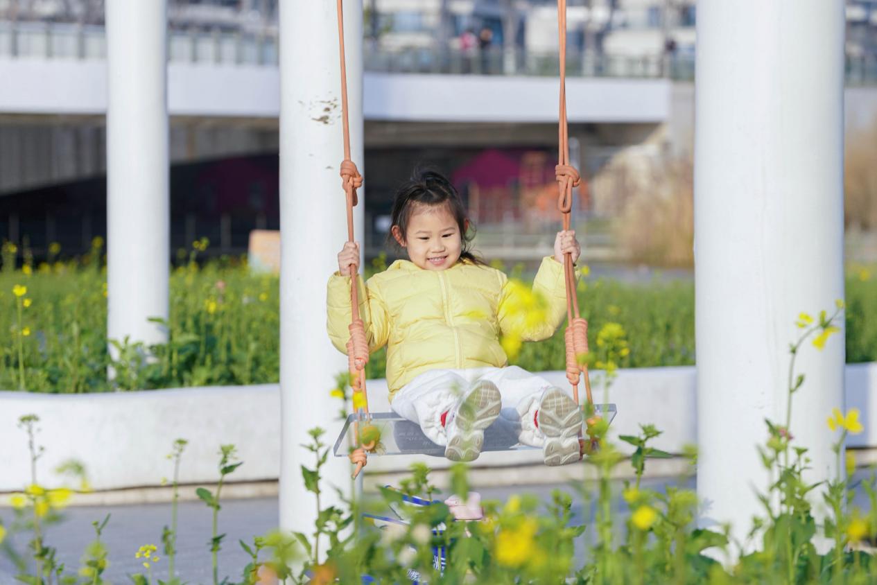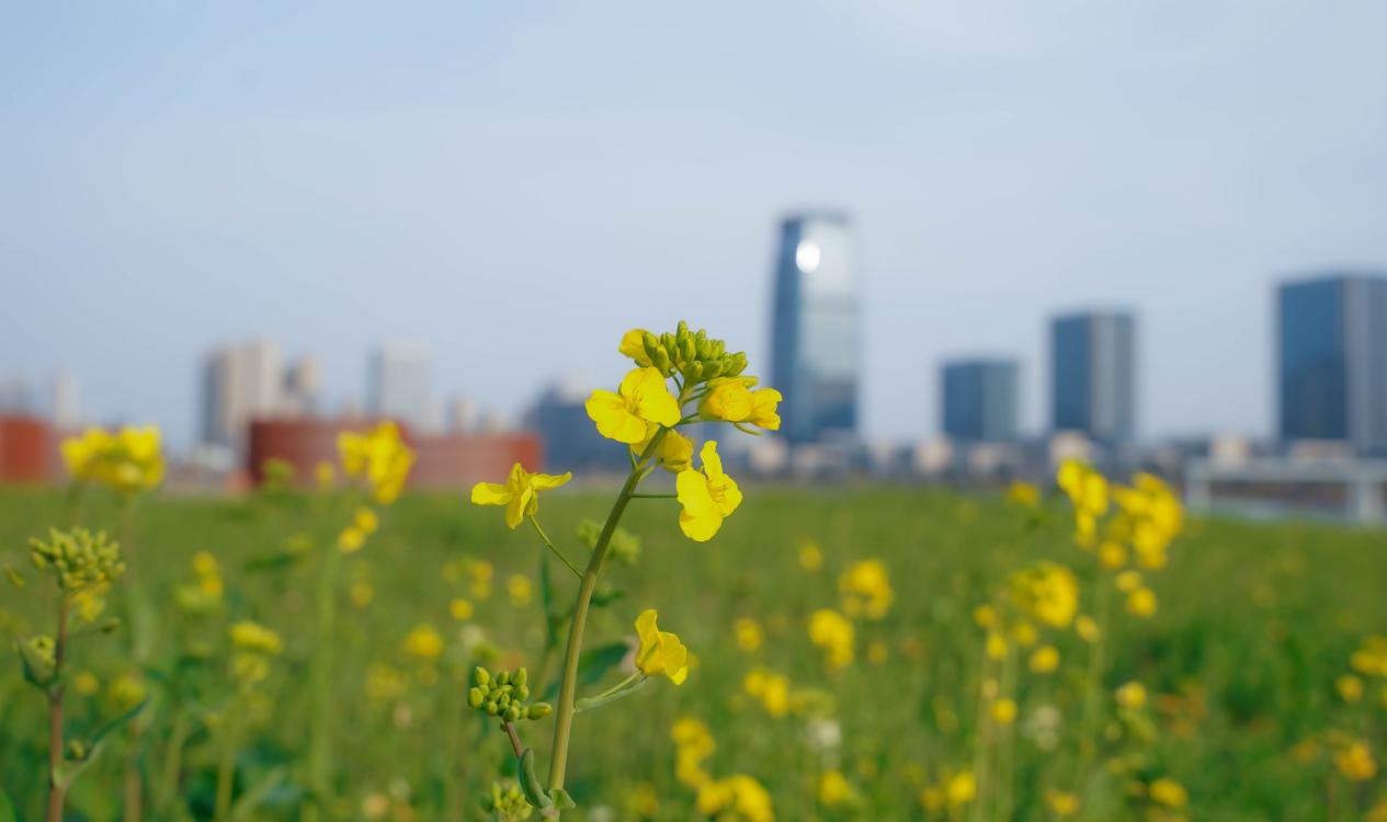穿过公园西侧的云帆桥,便是油菜花田。最先映入眼帘的是一大片新绿,让人身心慢慢舒展开来,细细看来,嫩绿中有一簇簇金灿灿的黄色,展示出自然独有的生命力。开的最好的当属几架秋千旁的圆盘,里面的油菜花基本已经盛开,株株迎风摇曳,与智慧谷高楼、蓝天白云相互映衬。
